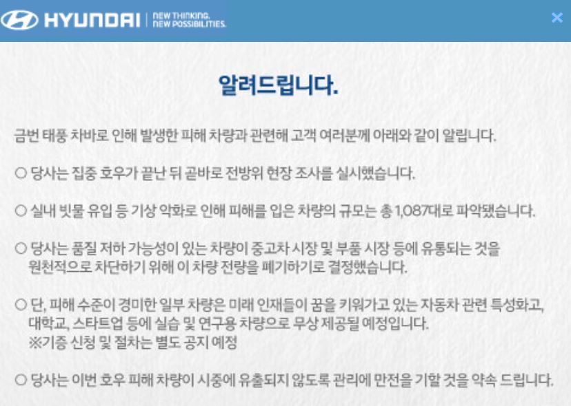 [아시아경제 배경환 기자] 현대자동차가 태풍 '차바'로 인해 발생한 침수차를 전량 폐기한다고 19일 밝혔다.현대차에 따르면 이번에 폐기 처리되는 차는 총 1087대로 현대차 울산공장 출고센터와 배송센터에서 침수됐다. 현대차는 침수로 품질이 저하된 차량이 중고차 시장에서 재판매되는 것을 원천적으로 차단하기 위해 침수차량을 전량 폐기하기로 방침을 정했다. 실내에 빗물이 유입된 경우 무조건 폐기된다. 우선 손해보험사와 협의를 통해 직접 침수차를 전량 폐차하기로 했다. 이번 조치로 침수차량은 물론 그 부품까지도 시중에 유통되는 것이 불가능해질 것이라고 설명했다. 다만 폐기대상 차량 가운데 피해 수준이 경미한 차량은 자동차 관련 특성화고와 대학교, 스타트업(벤처기업)에서 실습 및 연구용 차량으로 요청이 들어올 경우에 한해 무상으로 제공하기로 했다. 연구·시험용 차량은 '자동차제작증'이 발급되지 않아 차량등록 및 운행 자체가불가능하므로 이 역시 중고차로 판매되는 것이 원천 차단된다. 한편 현대차는 무상 제공하는 차량이 교육, 연구 목적으로 적합하게 활용될 수 있도록 자격 요건과 기준을 마련하는 대로 전국 유관기관을 통해 신청을 받을 예정이다.배경환 기자 khbae@asiae.co.kr<ⓒ세계를 보는 창 경제를 보는 눈, 아시아경제(www.asiae.co.kr) 무단전재 배포금지>