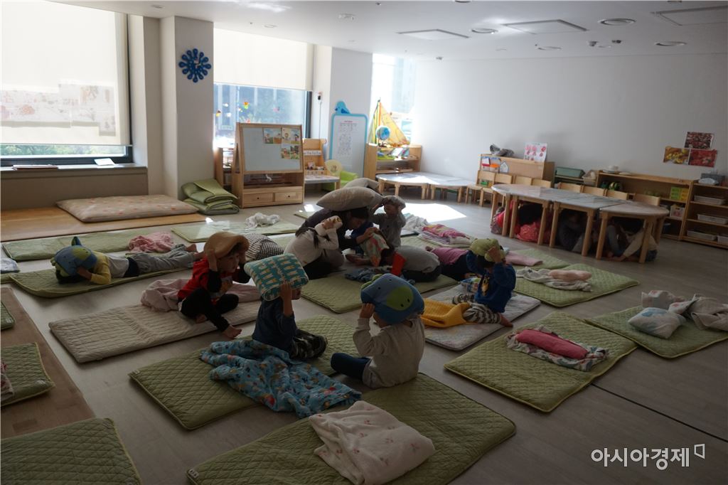 이날 이곳 어린이집에서는 민방위의 날을 맞아 실전을 방불케 하는 지진대피 훈련이 진행됐다. 69명의 아이들과 20명의 선생님들이 있는 이곳은 도심 대형 건물 2층에 위치했다. 선생님들은 지진에 건물이 무너질 수 있는 상황을 가정해 지진 발생부터 건물 밖 대피까지 실감나는 지진 훈련을 펼쳤다.평소 이 시간대는 아이들이 낮잠을 자는 시간이기 때문에 몇몇 어린이들은 막 잠에서 깬 듯 졸린 눈을 비비면서도 선생님들의 지시에 맞춰 신발을 신고 밖으로 나갔다. 한 아이는 "(바쁠 땐) 양말도 신으면 안 된다"며 서둘러 뛰어나가는 기지를 보이기도 했다. 1층으로 내려갈 때는 엘리베이터 대신 비상계단을 이용했다. 아이들은 고사리 같은 손으로 난간 손잡이를 꼭 잡고 내려갔다. 먼저 이곳으로 대피하고 있던 다른 층 직원들은 아이들을 위해 순서를 기다리면서도 다치는 아이들이 없나 주의 깊게 살펴봤다.원래 이곳 어린이집은 지진이 일어나면 위험 요소가 가장 적은 광화문 광장으로 대피해야 하지만 어린 아이들의 안전을 고려해 건물 1층 밖 화단으로 대피장소를 정했다. 대신 여러 명의 안전 직원들과 응급구호소를 배치해 아이들의 대피훈련을 도왔다. 90명 정도의 인원이 모두 이동하는데 8분도 채 걸리지 않았다.몇몇 아이들은 안전한 장소로 대피했음에도 손으로 머리를 감싸며 사전에 받은 안전교육을 착실히 이행했다. 이곳은 직장 어린이집이라 대피훈련 중 엄마를 만나는 어린이도 있었다. 아이는 엄마를 발견하고서도 잠시 멈칫 거렸지만 훈련을 위해 애써 무거운 발걸음을 돌렸다. 학부모 이만영(33)씨는 "아이가 훈련을 잘 받는 걸 보니 마음이 놓인다"면서도 "평소 어린이집에서 소방훈련을 잘 받아 요령을 잘 알고 있더라"고 말했다.어린이집 아이들이 지진대피 교육을 듣고 있다. (사진=SK행복어린이집)