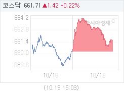 2016년 10월 19일 코스닥 지수는 0.97p (0.15%) 상승한 661.26로 마감했습니다.금일 (2시40분 기준) 코스닥 주요 상승 종목은 바른손,CMG제약,에스아이티글로벌이며, 코스닥 주요 하락 종목은 삼원테크,세븐스타웍스,수성입니다.아경봇 기자 r2@asiae.co.kr<ⓒ세계를 보는 창 경제를 보는 눈, 아시아경제(www.asiae.co.kr) 무단전재 배포금지>