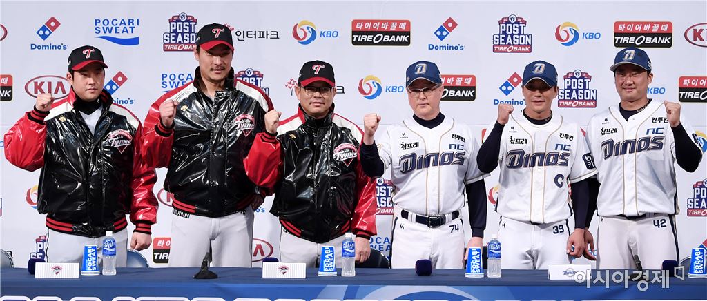 [아시아경제 김현민 기자]프로야구 2016 KBO 포스트시즌 플레이오프 미디어데이가 20일 마산종합운동장 올림픽기념관에서 열렸다. 양 팀 선수들이 파이팅을 외치고 있다. 왼쪽부터 유강남, 이동현, 양상문 감독(이상 LG), 김경문 감독, 이종욱, 김태군(이상 NC).김현민 기자 kimhyun81@asiae.co.kr<ⓒ세계를 보는 창 경제를 보는 눈, 아시아경제(www.asiae.co.kr) 무단전재 배포금지>