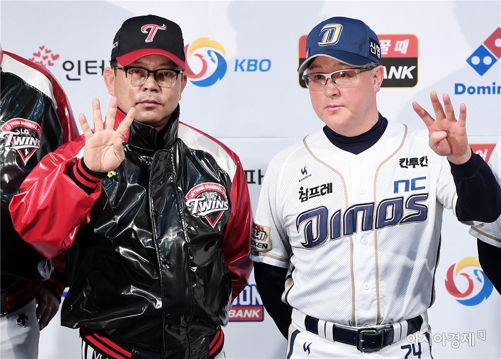 [아시아경제 김현민 기자]프로야구 2016 KBO 포스트시즌 플레이오프 미디어데이가 20일 마산종합운동장 올림픽기념관에서 열렸다. LG 양상문 감독(왼쪽)과 NC 김경문 감독이 예상 차전 수를 손가락으로 들어보이고 있다.김현민 기자 kimhyun81@asiae.co.kr<ⓒ세계를 보는 창 경제를 보는 눈, 아시아경제(www.asiae.co.kr) 무단전재 배포금지>