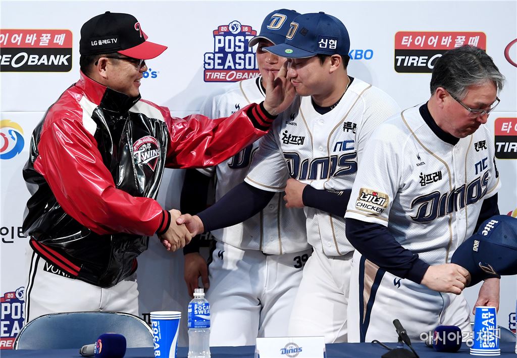 [아시아경제 김현민 기자]프로야구 2016 KBO 포스트시즌 플레이오프 미디어데이가 20일 마산종합운동장 올림픽기념관에서 열렸다. LG 양상문 감독이 NC 김태군의 얼굴을 쓰다듬고 있다.김현민 기자 kimhyun81@asiae.co.kr<ⓒ세계를 보는 창 경제를 보는 눈, 아시아경제(www.asiae.co.kr) 무단전재 배포금지>