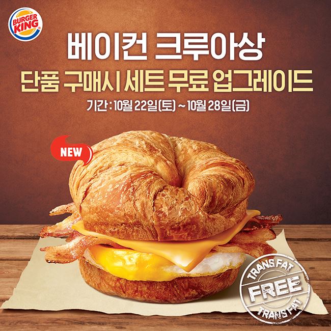 [아시아경제 오주연 기자]버거킹이 오는 28일까지 '베이컨 크루아상 세트 무료 업그레이드' 행사를 진행한다고 21일 밝혔다.지난달 새롭게 출시한 베이컨 크루아상은 킹모닝 신메뉴로, 고소한 향의 부드러운 트랜스지방 프리 크루아상에 베이컨과 계란 패티, 슬라이스 치즈를 더해 든든하게 먹을 수 있는 것이 특징이다.버거킹은 카카오톡 플러스 친구 대상으로 이달 22일부터 28일까지 사용가능한 베이컨 크루아상 단품 구매 시 세트 무료 업그레이드 쿠폰을 증정한다. 킹모닝 세트는 크루아상과 RA인증 커피 한 잔, 바삭한 해쉬브라운으로 구성됐다. 카카오톡을 사용하는 고객이라면 누구든지 버거킹을 플러스 친구로 등록할 수 있으며, 등록 시 다양한 프로모션 소식과 할인 혜택을 받을 수 있다.오주연 기자 moon170@asiae.co.kr<ⓒ세계를 보는 창 경제를 보는 눈, 아시아경제(www.asiae.co.kr) 무단전재 배포금지>