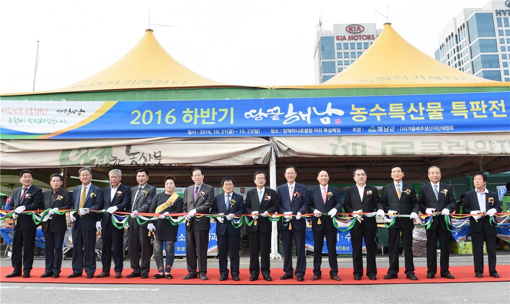 21일 ‘해남군 우수농특산물 직거래장터 개장식’에 참석한 (왼쪽에서 8번째부터)김병문 농협유통 대표이사, 윤영일 국회의원, 양재승 해남군수 권한대행, 박태선 농협해남군지부장, 김봉규 겨울배추생산자협의회장이 기념촬영을 하고 있다.