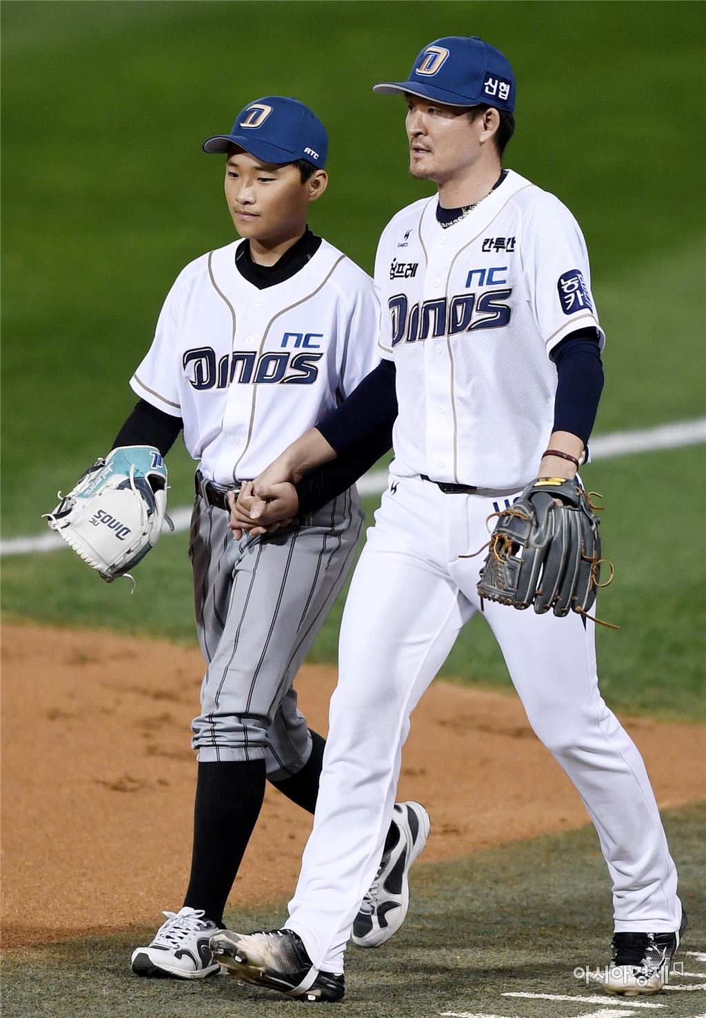 [아시아경제 김현민 기자]프로야구 LG와 NC의 2016 KBO 포스트시즌 플레이오프 1차전이 21일 마산구장에서 열렸다. 경기에 앞서 '암 극복'이라는 공통점을 가진 위주빈과 NC 원종현이 시구, 시포를 위해 입장하고 있다.김현민 기자 kimhyun81@asiae.co.kr<ⓒ세계를 보는 창 경제를 보는 눈, 아시아경제(www.asiae.co.kr) 무단전재 배포금지>