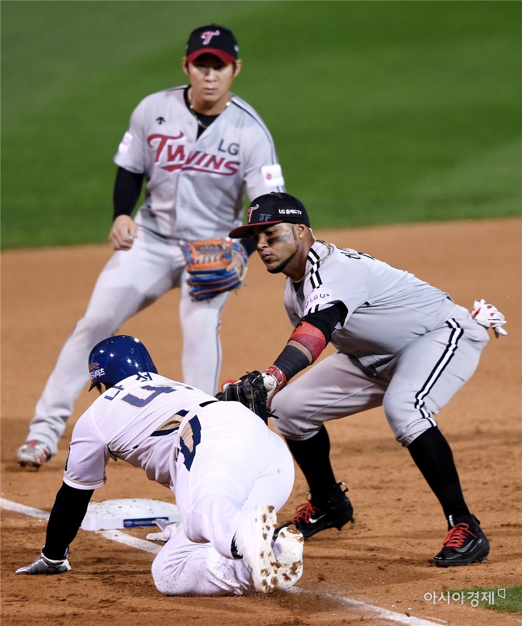 [아시아경제 김현민 기자]프로야구 LG와 NC의 2016 KBO 포스트시즌 플레이오프 1차전이 21일 마산구장에서 열렸다. 4회말 1사 1,3루에서 LG 3루수 히메네스가 NC 박석민의 3루땅볼 때 협살에 걸린 3루주자 나성범을 태그아웃 시키고 있다.김현민 기자 kimhyun81@asiae.co.kr<ⓒ세계를 보는 창 경제를 보는 눈, 아시아경제(www.asiae.co.kr) 무단전재 배포금지>