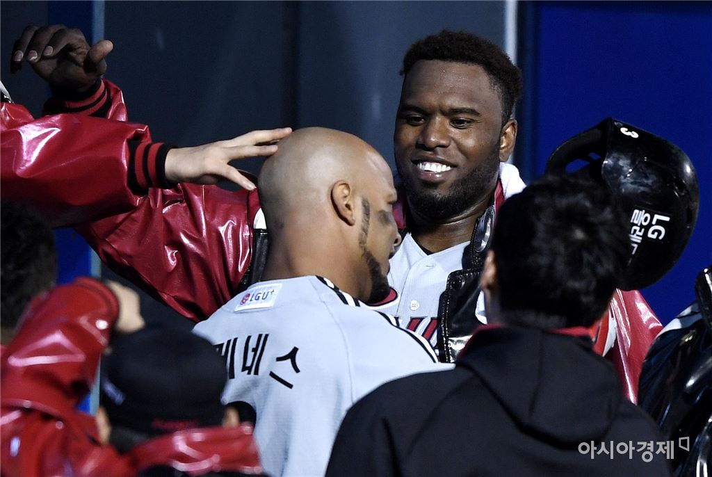 [아시아경제 김현민 기자]프로야구 LG와 NC의 2016 KBO 포스트시즌 플레이오프 1차전이 21일 마산구장에서 열렸다. 7회초 LG 선두타자 히메네스가 NC 선발 해커를 상대로 좌월 선제 솔로 홈런을 치고 선발투수 소사와 기쁨을 나누고 있다.김현민 기자 kimhyun81@asiae.co.kr<ⓒ세계를 보는 창 경제를 보는 눈, 아시아경제(www.asiae.co.kr) 무단전재 배포금지>