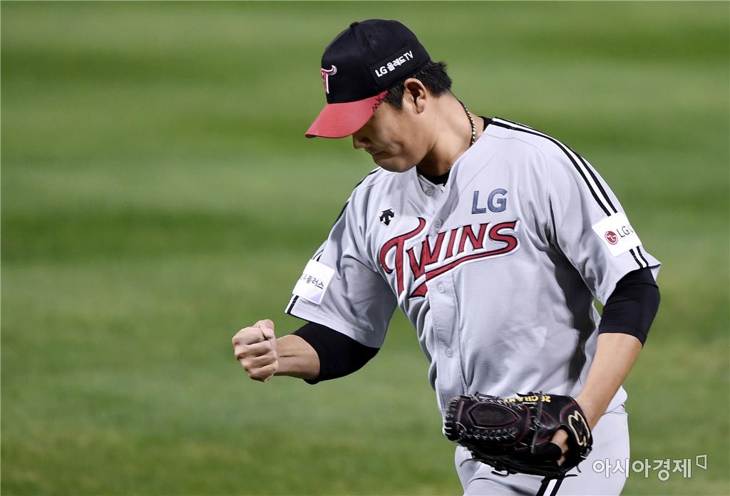 [아시아경제 김현민 기자]프로야구 LG와 NC의 2016 KBO 포스트시즌 플레이오프 1차전이 21일 마산구장에서 열렸다. 7회말 1사 1,2루에서 LG 구원투수 정찬헌이 NC 손시헌을 3루수 병살타로 처리한 뒤 주먹을 쥐며 기뻐하고 있다.김현민 기자 kimhyun81@asiae.co.kr<ⓒ세계를 보는 창 경제를 보는 눈, 아시아경제(www.asiae.co.kr) 무단전재 배포금지>