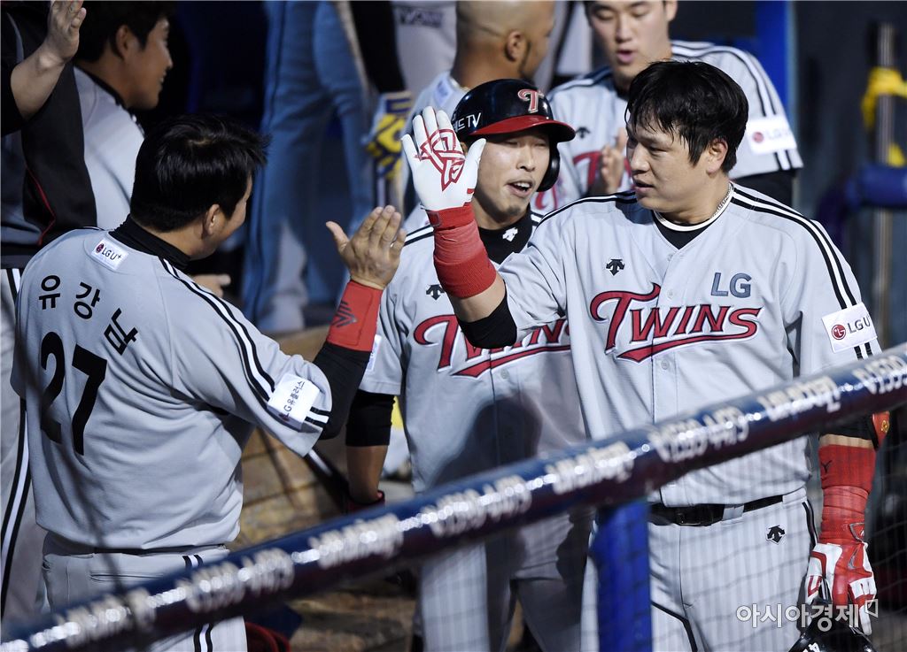 [아시아경제 김현민 기자]프로야구 LG와 NC의 2016 KBO 포스트시즌 플레이오프 1차전이 21일 마산구장에서 열렸다. 8회초 LG 선두타자 정상호가 NC 선발 해커를 상대로 추가 좌월 솔로 홈런을 치고 유강남과 하이파이브하고 있다.김현민 기자 kimhyun81@asiae.co.kr<ⓒ세계를 보는 창 경제를 보는 눈, 아시아경제(www.asiae.co.kr) 무단전재 배포금지>