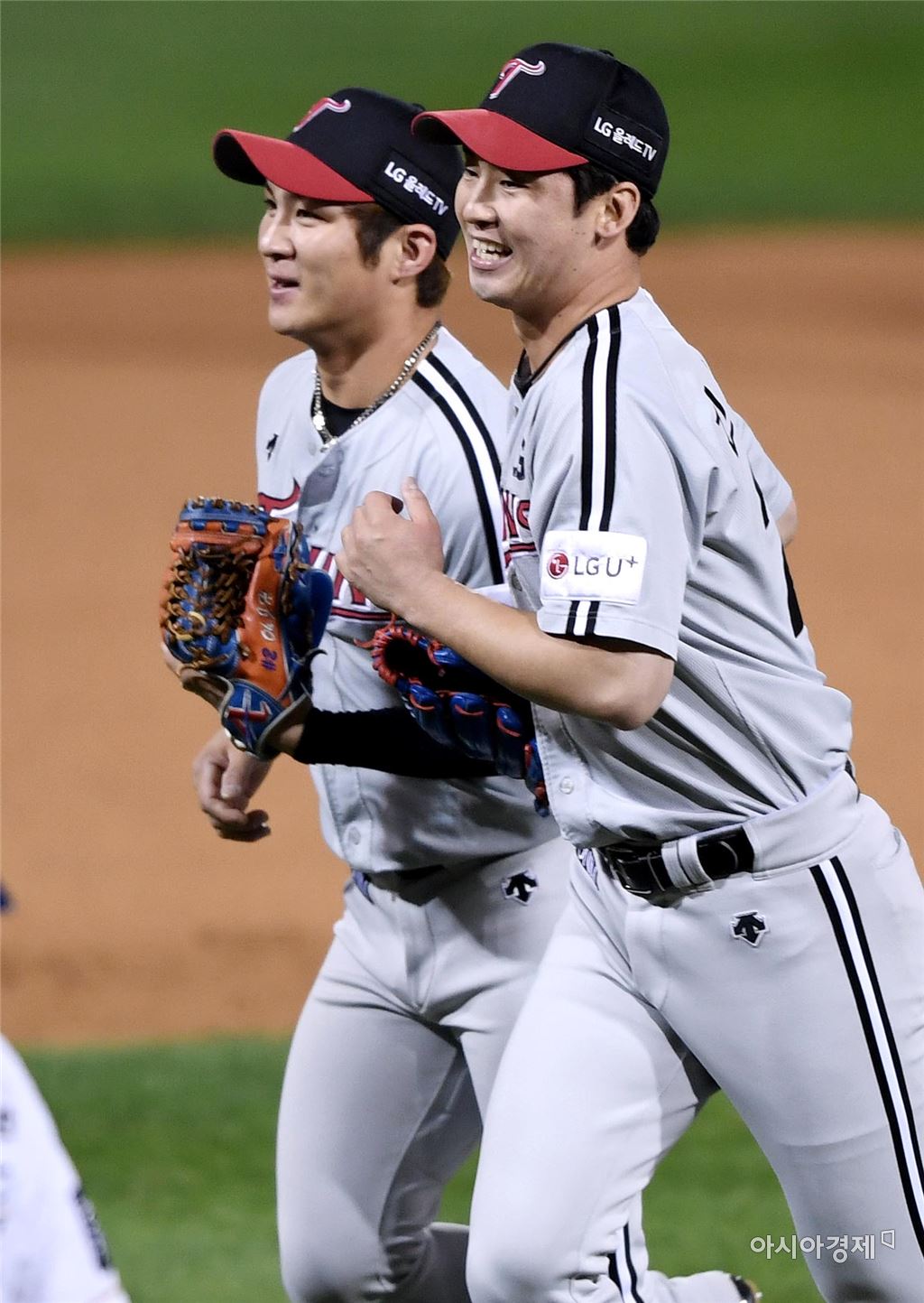 [아시아경제 김현민 기자]프로야구 LG와 NC의 2016 KBO 포스트시즌 플레이오프 1차전이 21일 마산구장에서 열렸다. 8회말 1사 1루에서 LG 구원투수 진해수가 NC 나성범을 2루수 병살타로 처리한 뒤 오지환과 기뻐하고 있다.김현민 기자 kimhyun81@asiae.co.kr<ⓒ세계를 보는 창 경제를 보는 눈, 아시아경제(www.asiae.co.kr) 무단전재 배포금지>