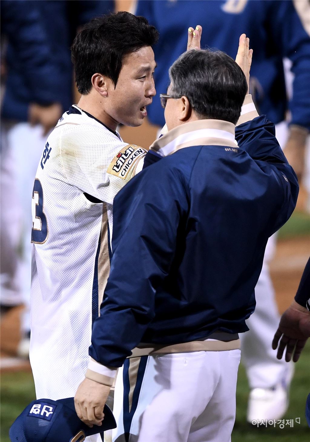 [아시아경제 김현민 기자]프로야구 LG와 NC의 2016 KBO 포스트시즌 플레이오프 1차전이 21일 마산구장에서 열렸다. 9회말 1사 만루에서 NC 용덕한이 끝내기 안타를 치며 팀의 3-2 역전승를 확정한 뒤 김경문 감독과 기뻐하고 있다.김현민 기자 kimhyun81@asiae.co.kr<ⓒ세계를 보는 창 경제를 보는 눈, 아시아경제(www.asiae.co.kr) 무단전재 배포금지>