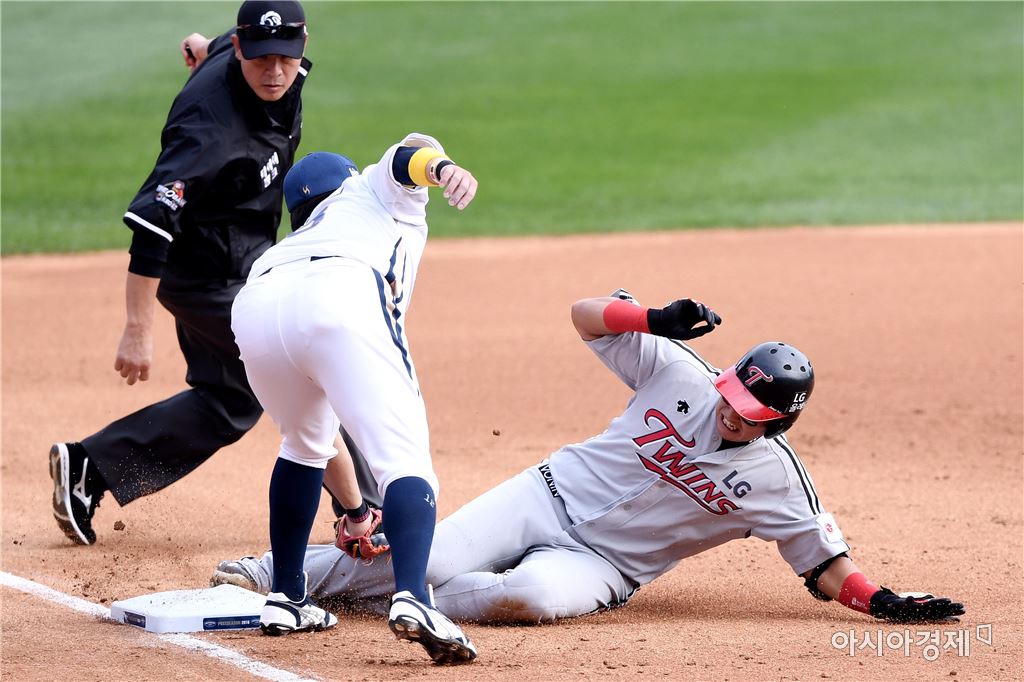 [창원=아시아경제 김현민 기자]프로야구 LG와 NC의 2016 KBO 포스트시즌 플레이오프 2차전이 22일 마산구장에서 열렸다. 5회초 1사에서 LG 채은성이 우중간 3루타를 치고 출루하고 있다.김현민 기자 kimhyun81@asiae.co.kr<ⓒ세계를 보는 창 경제를 보는 눈, 아시아경제(www.asiae.co.kr) 무단전재 배포금지>