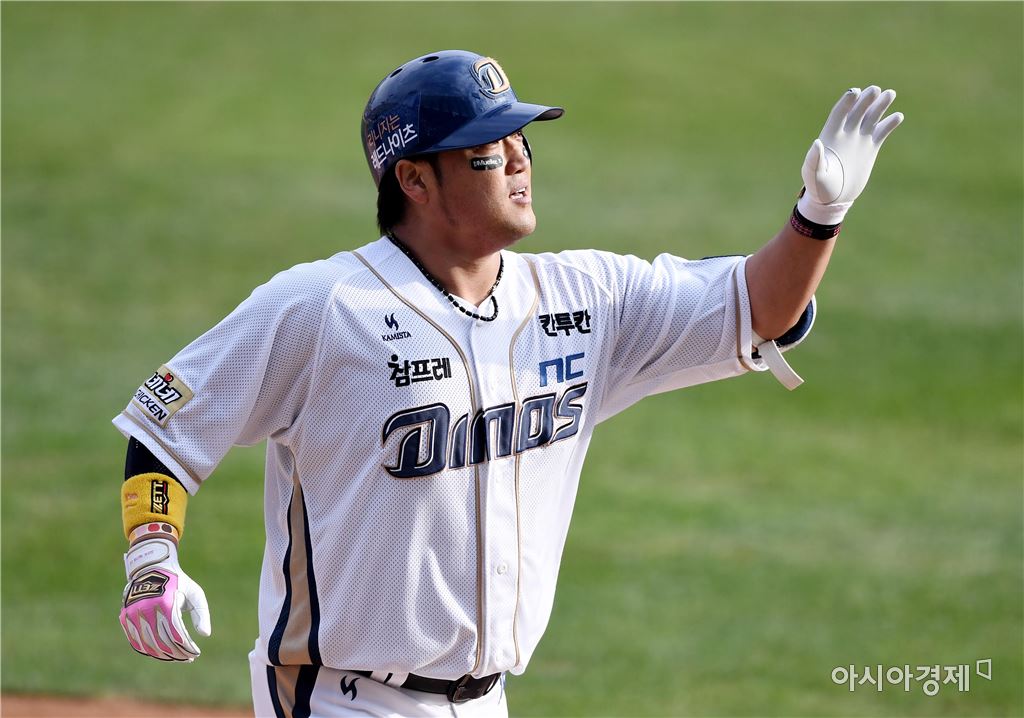 [창원=아시아경제 김현민 기자]프로야구 LG와 NC의 2016 KBO 포스트시즌 플레이오프 2차전이 22일 마산구장에서 열렸다. 7회말 2사에서 NC 박석민이 LG 선발 허프를 상대로 선제 투런 홈런을 치고 환호하고 있다.김현민 기자 kimhyun81@asiae.co.kr<ⓒ세계를 보는 창 경제를 보는 눈, 아시아경제(www.asiae.co.kr) 무단전재 배포금지>