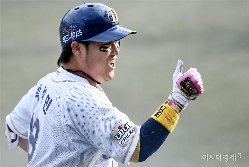 [창원=아시아경제 김현민 기자]프로야구 LG와 NC의 2016 KBO 포스트시즌 플레이오프 2차전이 22일 마산구장에서 열렸다. 7회말 2사에서 NC 박석민이 LG 선발 허프를 상대로 선제 투런 홈런을 치고 환호하고 있다.김현민 기자 kimhyun81@asiae.co.kr<ⓒ세계를 보는 창 경제를 보는 눈, 아시아경제(www.asiae.co.kr) 무단전재 배포금지>