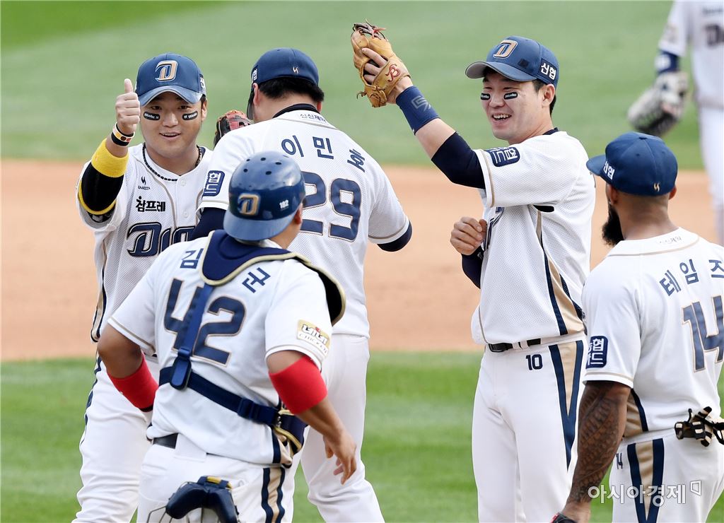 [창원=아시아경제 김현민 기자]프로야구 LG와 NC의 2016 KBO 포스트시즌 플레이오프 2차전이 22일 마산구장에서 열렸다. NC 박석민이 팀의 2-0 승리를 확정한 뒤 동료들과 기뻐하고 있다.김현민 기자 kimhyun81@asiae.co.kr<ⓒ세계를 보는 창 경제를 보는 눈, 아시아경제(www.asiae.co.kr) 무단전재 배포금지>