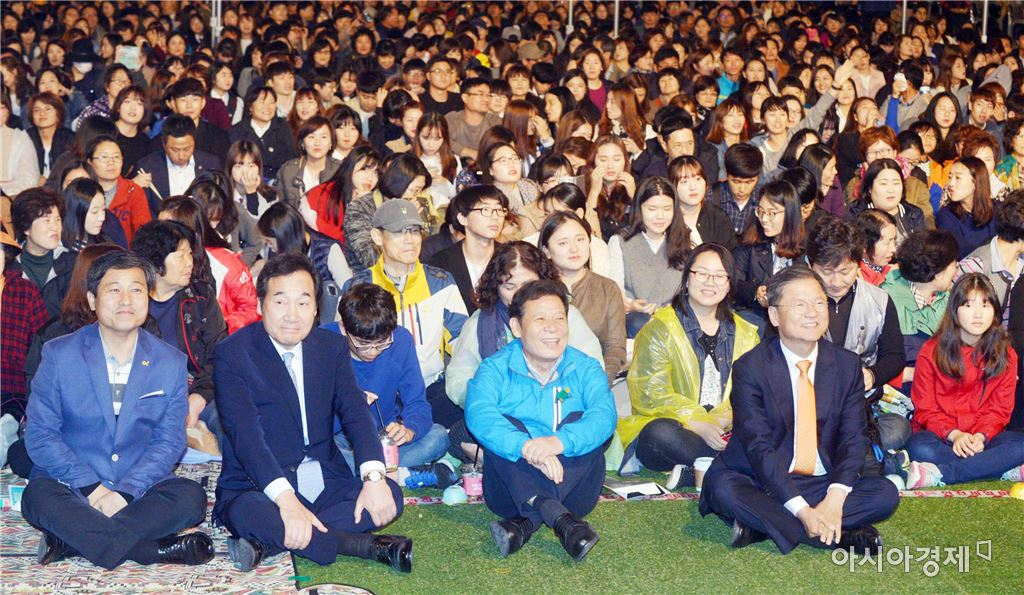 윤장현 광주광역시장이 21일 오후 동구 518민주광장에서 열린 2016 청년도시 컨퍼런스에 참석한 이낙연 전남도지사, 천정배 국회의원, 김영배 성북구청장과 함께 공연을 관람하고 있다.