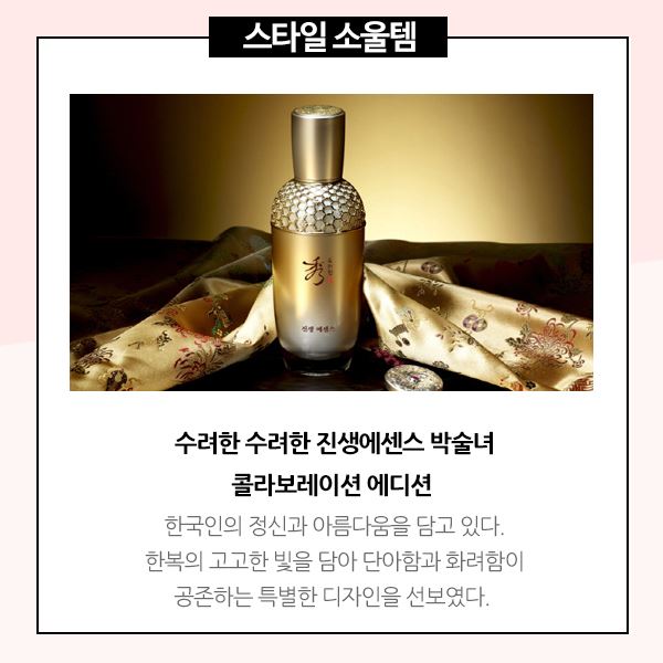 수려한이 1세대 한복 연구가 박술녀와 협업으로 한복의 아름다움 담은 '수려한 진생에센스 박술녀 콜라보레이션 에디션'을 출시했다. 이번 에디션은 한국인의 정신과 아름다움을 담고 있다. 한복의 고고한 빛을 담아 단아함과 화려함이 공존하는 특별한 디자인을 선보였다. 패키지에 옛 여성들의 부와 절개, 지조를 상징하는 매화꽃을 새겨 아름다움을 더했다.사진제공=베네피트