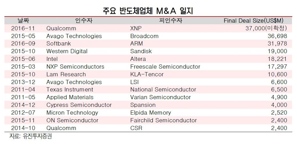 [아시아경제 김유리 기자] 퀄컴의 NXP반도체 인수 추진은 정보기술(IT) 산업의 성장 동력이 모바일에서 자율주행차로 전환되고 있음을 의미하는 시그널이라는 분석이 나왔다. 이정 유진투자증권 애널리스트는 24일 "퀄컴의 NXP반도체 인수가 이뤄지면, 이는 산업적으로 시사하는 바가 매우 크다"며 "향후 반도체 시장의 핵심 트렌드가 모바일용에서 자동차용으로 이전한다는 것, 즉 IT 산업에서 스마트폰을 이을 차세대 성장 동력이 자율주행차임을 말해주고 있는 것"이라고 말했다.블룸버그는 지난 20일 모바일용 반도체 세계 1위업체인 퀄컴이 자동차용 반도체 세계 1위업체 NXP반도체 인수를 추진 중이라고 보도했다. 이번 인수합병(M&A)이 성사되면 인수 규모는370억달러(약 42조원)로, 반도체산업 사상 최대 규모의 인수합병이 될 전망이다. 블룸버그는 다음 달 2일 퀄컴의 실적 발표일에 맞춰 양사의 합병이 발표될 것이라고 내다봤다. 퀄컴은 스마트폰에 탑재되는 애플리케이션 프로세서(AP) 분야 세계 1위업체다. 모바일용 반도체에서 핵심적 특허를 보유한 모바일용 반도체 분야의 절대강자다. NXP반도체는 2006년 필립스의 반도체부문에서 분사한 차량용 반도체시장의 세계 1위 업체다. 자동차 보안 분야의 반도체를 주로 생산하고 있다. 즉 자동차의 에어백과 인포테인먼트시스템을 비롯해 ID카드, 교통카드, 스마트폰 결제시스템 등에 들어가는 칩 등을 주력으로 양산한다. 이 애널리스트는 "퀄컴은 주차를 하면 자동으로 충전이 되는 '퀄컴 헤일로' 오토모티브 주차시스템을 개발 중"이라며 "자동차 시큐어 커넥티드시스템에 대한 원천기술의 필요성으로 NXP반도체 인수를 시도하고 있는 것으로 알려졌다"고 말했다. 퀄컴이 NXP반도체 인수에 성공하면 모바일용 중심의 사업구조에서 벗어나 신성장 동력이 될 자동차용 반도체시장에 성공적으로 진출하게 될 것이라는 전망이다.그는 "스마트폰시장의 성장성이 둔화되면서 세계 IT 산업은 차세대 성장 동력에 주목하고 있다"며 "현재 스마트폰의 성장을 이을 차세대 성장 동력으로 자율주행차가 부각되고 있고, 구글과 애플, 인텔, 삼성전자를 포함한 글로벌 IT 대형업체들 모두 자율주행차 시장 진출을 위해 적극적인 M&A와 협력 등을 전개하고 있다"고 강조했다. 김유리 기자 yr61@asiae.co.kr<ⓒ세계를 보는 창 경제를 보는 눈, 아시아경제(www.asiae.co.kr) 무단전재 배포금지>