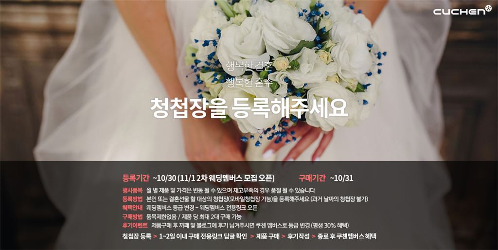 [아시아경제 김대섭 기자] 쿠첸은 혼수가전을 최대 50% 할인 구매할 수 있는 '청첩장 등록' 이벤트를 진행한다고 24일 밝혔다.이번 행사는 혼수가전이 필요한 결혼을 앞둔 예비부부나 결혼을 앞둔 가까운 지인에게 결혼 선물을 준비하는 소비자들이라면 누구든지 참여할 수 있다. 오는 30일까지 쿠첸샵을 통해 등록하면 된다.이벤트 기간 내 본인 또는 결혼 선물을 할 대상의 청첩장(과거 날짜 청첩장 등록 불가)을 등록하면 웨딩멤버스로 등급이 변경된다. 쿠첸 제품을 최대 50% 할인해 구매할 수 있는 웨딩멤버스 전용링크로 접속할 수 있다. 링크를 통해 신제품 IH밥솥, 전기레인지뿐, 이유식밥솥, 분유포트 등 다양한 제품을 웨딩멤버스 전용 가격에 구매할 수 있다. 1인당 품목에 상관없이 최대 2개까지 구매가 가능하다.쿠첸 관계자는 "제품 구매 후 쿠첸 공식 카페와 블로그에 후기를 남기도 쿠첸 제품을 평생 30% 할인 혜택을 받을 수 있는 쿠첸 멤버스로 등급이 변경된다"며 "웨딩멤버스 제품 구매는 오는 31일까지 가능하고 2차 웨딩멤버스 모집은 다음 달 1일 시작될 예정"이라고 말했다. 김대섭 기자 joas11@asiae.co.kr<ⓒ세계를 보는 창 경제를 보는 눈, 아시아경제(www.asiae.co.kr) 무단전재 배포금지>