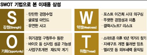 ① SWOT 기법으로 본 '이재용 삼성'이재용 부회장이 삼성전자 위기 상황에서 경영 전면에 나선 데 대해 업계는 기대 반 걱정 반 시선을 보내고 있다. 그에게 놓인 길은 꽃길보다는 가시밭길에 가깝기 때문이다. 야구로 비유하면 2대 1로 앞선 9회 말 무사 만루의 위기 상황에서 등판한 셈이다. 대표적인 경영전략 분석 도구인 'SWOT 기법'을 활용해 '이재용 삼성'의 강점(Strength), 약점(Weakness), 기회(Opportunity), 위협(Threat) 요인을 살펴봤다.
