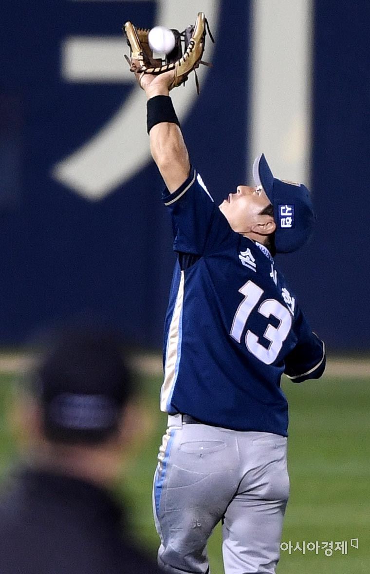 [아시아경제 김현민 기자]프로야구 NC와 LG의 2016 KBO 포스트시즌 플레이오프 3차전이 24일 잠실구장에서 열렸다. 4회말 1사 1루에서 NC 유격수 손시헌이 LG 박용택의 뜬공을 잡아내고 있다. 김현민 기자 kimhyun81@asiae.co.kr<ⓒ세계를 보는 창 경제를 보는 눈, 아시아경제(www.asiae.co.kr) 무단전재 배포금지>