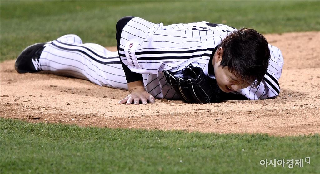 [아시아경제 김현민 기자]프로야구 NC와 LG의 2016 KBO 포스트시즌 플레이오프 3차전이 24일 잠실구장에서 열렸다. LG 선발 류제국이 5회초 1사 1루에서 NC 김태군의 투수 강습 타구를 피하다 넘어지고 있다. 김현민 기자 kimhyun81@asiae.co.kr<ⓒ세계를 보는 창 경제를 보는 눈, 아시아경제(www.asiae.co.kr) 무단전재 배포금지>