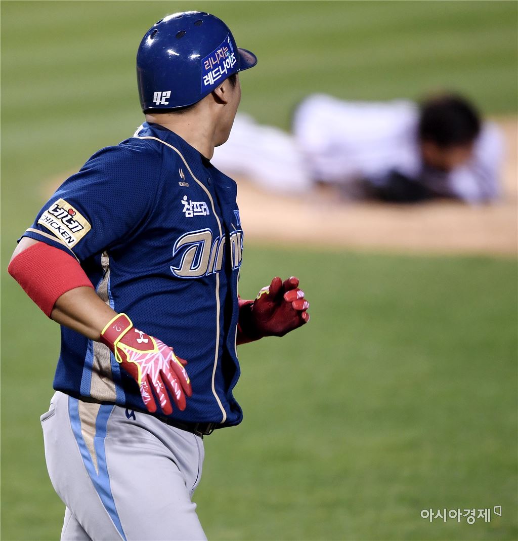 [아시아경제 김현민 기자]프로야구 NC와 LG의 2016 KBO 포스트시즌 플레이오프 3차전이 24일 잠실구장에서 열렸다. 5회초 1사 1루에서 NC 김태군이 LG 선발 류제국의 얼굴로 향하는 강습 타구를 치고 넘어진 류제국을 바라보며 달리고 있다. 김현민 기자 kimhyun81@asiae.co.kr<ⓒ세계를 보는 창 경제를 보는 눈, 아시아경제(www.asiae.co.kr) 무단전재 배포금지>