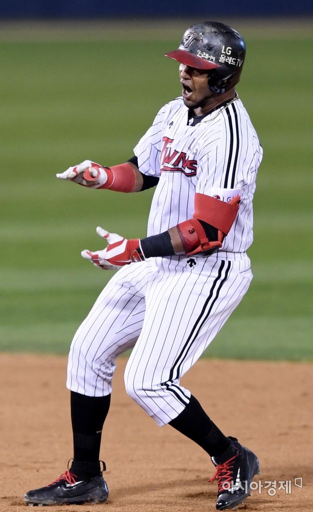 [아시아경제 김현민 기자]프로야구 NC와 LG의 2016 KBO 포스트시즌 플레이오프 3차전이 24일 잠실구장에서 열렸다. 6회말 1사 1루에서 LG 히메네스가 좌익수 옆 2루타를 치고 환호하고 있다. 김현민 기자 kimhyun81@asiae.co.kr<ⓒ세계를 보는 창 경제를 보는 눈, 아시아경제(www.asiae.co.kr) 무단전재 배포금지>