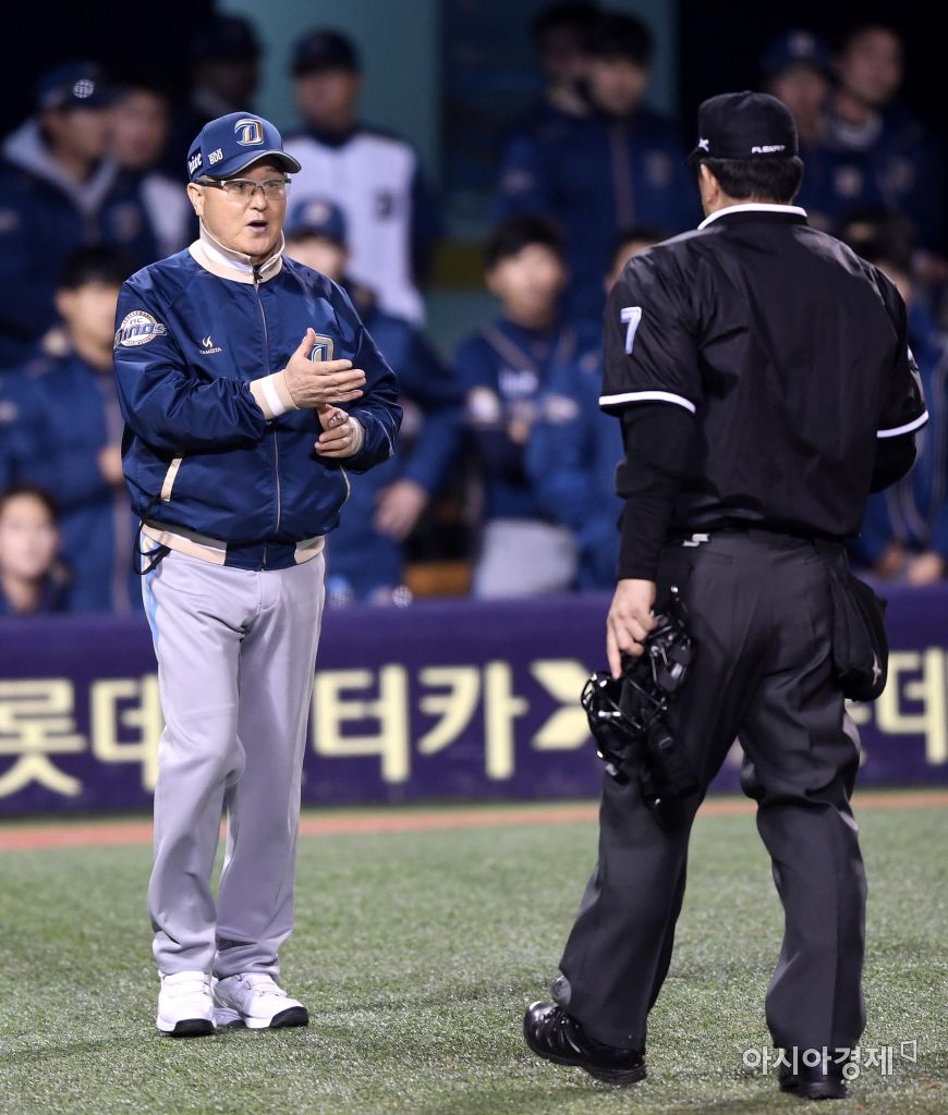 [아시아경제 김현민 기자]프로야구 NC와 LG의 2016 KBO 포스트시즌 플레이오프 3차전이 24일 잠실구장에서 열렸다. 8회말 무사 1루에서 LG 이천웅의 몸에 맞는 공 때 NC 김경문 감독이 문승훈 구심에 어필하고 있다. 김현민 기자 kimhyun81@asiae.co.kr<ⓒ세계를 보는 창 경제를 보는 눈, 아시아경제(www.asiae.co.kr) 무단전재 배포금지>