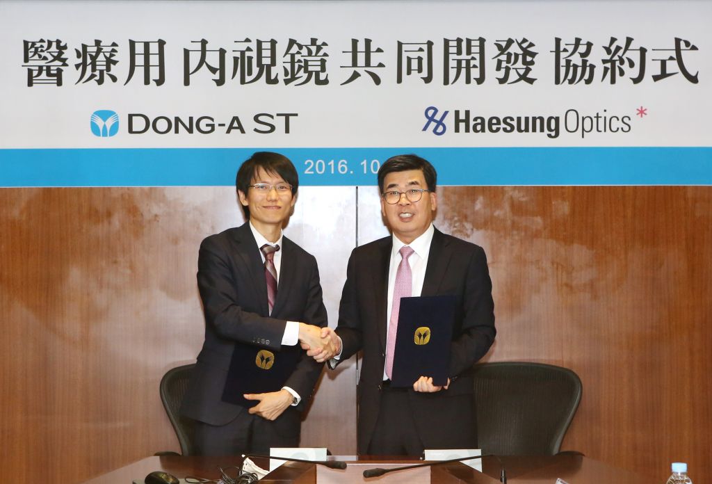 강수형 동아에스티 사장(오른쪽)과 이재선 해성옵틱스 사장이 의료용 내시경 개발 및 판매에 관한 양해각서 체결 후 기념촬영을 하고 있다.
