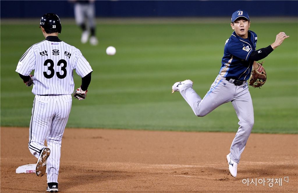 [아시아경제 김현민 기자]프로야구 NC와 LG의 2016 KBO 포스트시즌 플레이오프 4차전이 25일 잠실구장에서 열렸다. 1회말 1사 1,3루에서 NC 유격수 손시헌이 LG 히메네스의 2루 땅볼 때 1루주자 박용택을 포스아웃 시키고 1루로 송구하고 있다. 합의판정 결과 병살타 아웃.김현민 기자 kimhyun81@asiae.co.kr<ⓒ세계를 보는 창 경제를 보는 눈, 아시아경제(www.asiae.co.kr) 무단전재 배포금지>