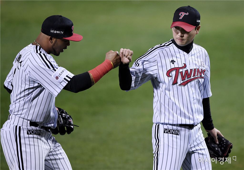 [아시아경제 김현민 기자]프로야구 NC와 LG의 2016 KBO 포스트시즌 플레이오프 4차전이 25일 잠실구장에서 열렸다. LG 선발투수 우규민이 1회초 수비를 삼자범퇴 무실점으로 막고 히메네스와 하이파이브하고 있다.김현민 기자 kimhyun81@asiae.co.kr<ⓒ세계를 보는 창 경제를 보는 눈, 아시아경제(www.asiae.co.kr) 무단전재 배포금지>