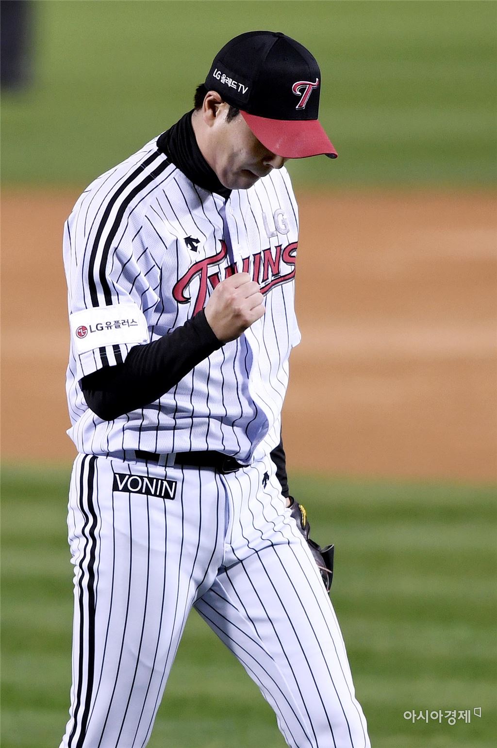 [아시아경제 김현민 기자]프로야구 NC와 LG의 2016 KBO 포스트시즌 플레이오프 4차전이 25일 잠실구장에서 열렸다. LG 선발투수 우규민이 1회초 수비를 삼자범퇴 무실점으로 막고 주먹을 쥐며 기뻐하고 있다.김현민 기자 kimhyun81@asiae.co.kr<ⓒ세계를 보는 창 경제를 보는 눈, 아시아경제(www.asiae.co.kr) 무단전재 배포금지>