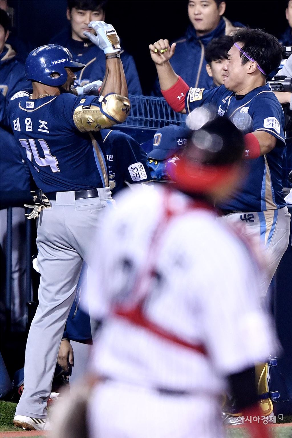 [아시아경제 김현민 기자]프로야구 NC와 LG의 2016 KBO 포스트시즌 플레이오프 4차전이 25일 잠실구장에서 열렸다. 4회초 1사에서 NC 테임즈가 LG 선발 우규민을 상대로 우월 동점 솔로 홈런을 치고 김태군과 세리머니하고 있다.김현민 기자 kimhyun81@asiae.co.kr<ⓒ세계를 보는 창 경제를 보는 눈, 아시아경제(www.asiae.co.kr) 무단전재 배포금지>