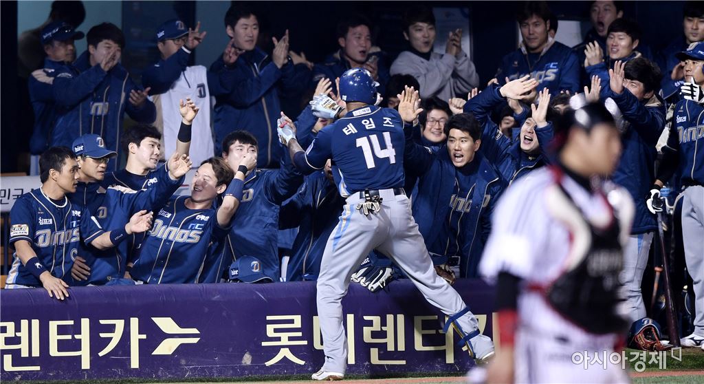 [아시아경제 김현민 기자]프로야구 NC와 LG의 2016 KBO 포스트시즌 플레이오프 4차전이 25일 잠실구장에서 열렸다. 4회초 1사에서 NC 테임즈가 LG 선발 우규민을 상대로 우월 동점 솔로 홈런을 치고 더그아웃의 동료들과 기뻐하고 있다.김현민 기자 kimhyun81@asiae.co.kr<ⓒ세계를 보는 창 경제를 보는 눈, 아시아경제(www.asiae.co.kr) 무단전재 배포금지>