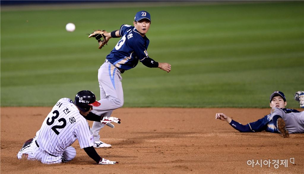 [아시아경제 김현민 기자]프로야구 NC와 LG의 2016 KBO 포스트시즌 플레이오프 4차전이 25일 잠실구장에서 열렸다. 3회말 무사 만루에서 NC 유격수 손시헌이 LG 박용택의 2루수 앞 땅볼 때 1루주자 이천웅을 포스아웃 시키고 1루로 송구하고 있다. 결과는 병살타 아웃.김현민 기자 kimhyun81@asiae.co.kr<ⓒ세계를 보는 창 경제를 보는 눈, 아시아경제(www.asiae.co.kr) 무단전재 배포금지>