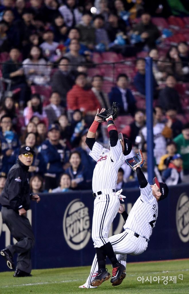 [아시아경제 김현민 기자]프로야구 NC와 LG의 2016 KBO 포스트시즌 플레이오프 4차전이 25일 잠실구장에서 열렸다. LG 3루수 히메네스가 4회초 NC 선두타자 나성범의 뜬공을 유격수 오지환과 충돌하며 잡아내고 있다.김현민 기자 kimhyun81@asiae.co.kr<ⓒ세계를 보는 창 경제를 보는 눈, 아시아경제(www.asiae.co.kr) 무단전재 배포금지>