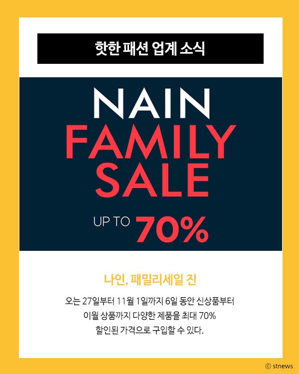 나인이 명동 롯데 본점 9층에서 패밀리세일을 진행한다. 오는 27일부터 11월 1일까지 6일 동안 신상품부터 이월 상품까지 다양한 제품을 최대 70% 할인된 가격으로 구입할 수 있다. 핸드메이드 코트를 특가에 판매한다. 오는 27일부터 30일까지 나인 앱 다운 회원 대상으로 일별 100명 선착순으로 니트 원피스, 티셔츠를 증정한다.사진제공=크록스