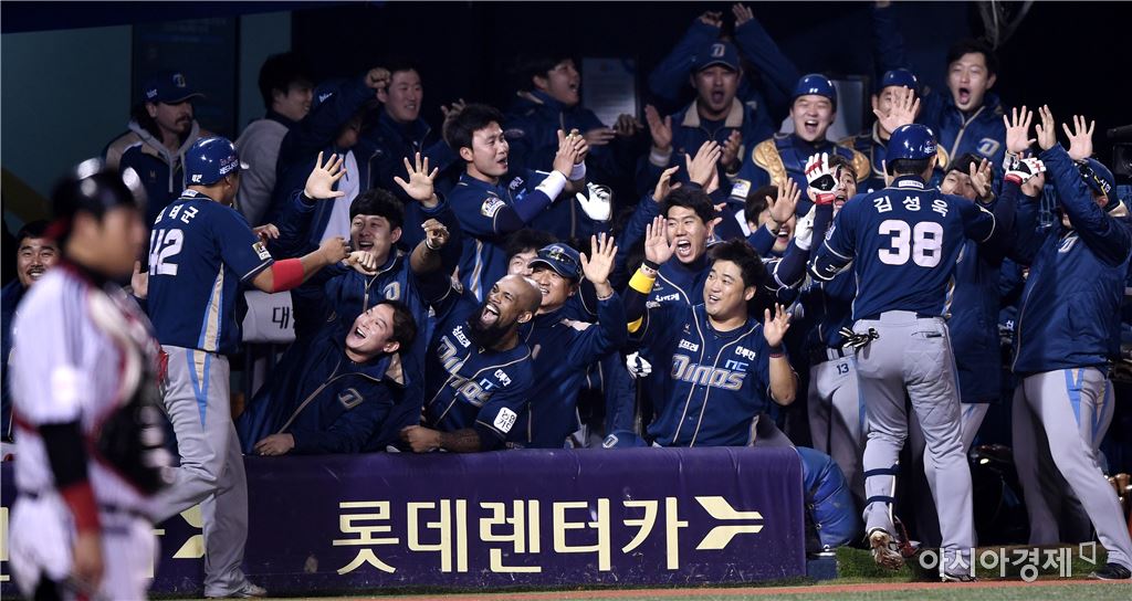 [아시아경제 김현민 기자]프로야구 NC와 LG의 2016 KBO 포스트시즌 플레이오프 4차전이 25일 잠실구장에서 열렸다. 7회초 1사 1루에서 NC 김성욱이 LG 허프를 상대로 좌월 추가 투런 홈런을 치고 더그아웃의 동료들과 환호하고 있다.김현민 기자 kimhyun81@asiae.co.kr<ⓒ세계를 보는 창 경제를 보는 눈, 아시아경제(www.asiae.co.kr) 무단전재 배포금지>