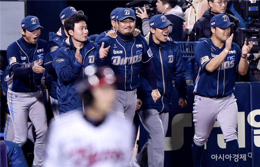 [아시아경제 김현민 기자]프로야구 NC와 LG의 2016 KBO 포스트시즌 플레이오프 4차전이 25일 잠실구장에서 열렸다. NC 더그아웃의 선수들이 8-3 승리로 한국시리즈 진출을 확정한 뒤 환호하며 그라운드로 나서고 있다.김현민 기자 kimhyun81@asiae.co.kr<ⓒ세계를 보는 창 경제를 보는 눈, 아시아경제(www.asiae.co.kr) 무단전재 배포금지>