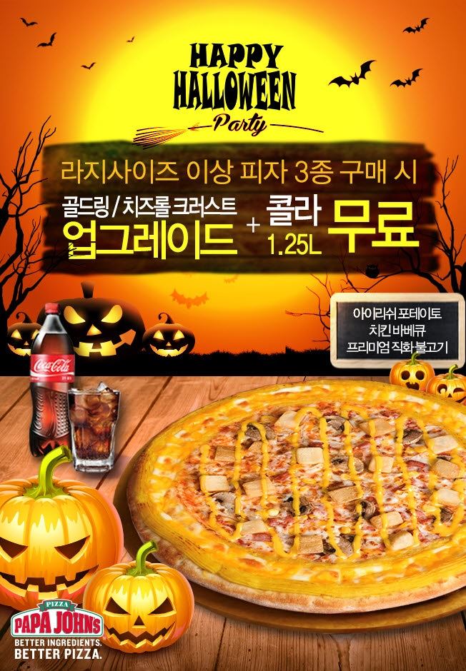 [아시아경제 오주연 기자]한국파파존스가 핼러윈을 맞아 인기 피자 3종에 크러스트 추가와 음료를 무료로 제공하는 ‘해피 핼러윈 파티 프로모션’을 진행한다고 26일 밝혔다.오는 31일까지 진행하는 이번 프로모션은 아이리쉬 포테이토, 치킨 바비큐, 프리미엄 직화 불고기 등 파파존스의 인기메뉴 3종을 라지 사이즈 이상 구매할 경우 적용된다. 개인의 기호에 맞게 골드링 크러스트와 치즈롤 크러스트 중 한 가지를 선택할 수 있으며 콜라(1.25ℓ)도 무료로 즐길 수 있다. 온라인 채널을 통해서 주문 가능하며, 배달과 방문 포장 고객 모두 프로모션 혜택을 적용받을 수 있다.오주연 기자 moon170@asiae.co.kr<ⓒ세계를 보는 창 경제를 보는 눈, 아시아경제(www.asiae.co.kr) 무단전재 배포금지>