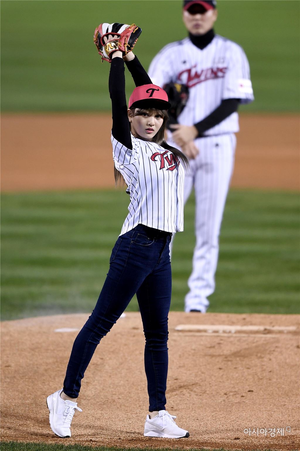 [아시아경제 김현민 기자]프로야구 NC와 LG의 2016 KBO 포스트시즌 플레이오프 4차전이 25일 잠실구장에서 열렸다. 경기에 앞서 걸그룹 트와이스의 지효가 시구하고 있다.김현민 기자 kimhyun81@asiae.co.kr<ⓒ세계를 보는 창 경제를 보는 눈, 아시아경제(www.asiae.co.kr) 무단전재 배포금지>