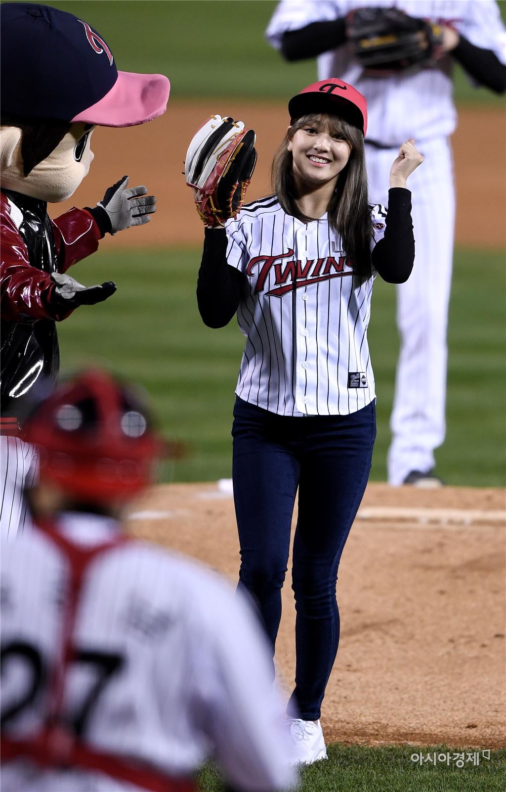 [아시아경제 김현민 기자]프로야구 NC와 LG의 2016 KBO 포스트시즌 플레이오프 4차전이 25일 잠실구장에서 열렸다. 경기에 앞서 걸그룹 트와이스의 지효가 시구하고 있다.김현민 기자 kimhyun81@asiae.co.kr<ⓒ세계를 보는 창 경제를 보는 눈, 아시아경제(www.asiae.co.kr) 무단전재 배포금지>