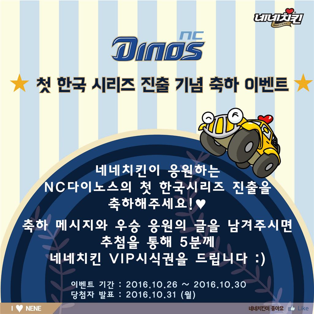 [아시아경제 오주연 기자]네네치킨이 NC다이노스의 첫 한국시리즈 진출을 기념해 축하 이벤트를 진행한다고 27일 밝혔다.네네치킨은 자사 공식 페이스북에 게재된 NC다이노스 한국시리즈 진출 기념 이벤트 게시물에 응원의 메시지를 남긴 고객 중 추첨을 통해 VIP시식권을 증정할 예정이다. 이벤트는 오는 30일까지 진행된다. 한편, 네네치킨이 2013년부터 4년 연속 NC다이노스의 공식 후원사로 활동하는 동안 NC다이노스가 한국시리즈에 진출한 것은 올해가 처음이다. 정규 시즌을 2위로 마무리해 2016 플레이오프에 진출한 NC다이노스는 지난 25일 잠실구장에서 열린 4차전에서 LG트윈스를 꺾고 창단 이후 첫 한국시리즈에 올랐다.오주연 기자 moon170@asiae.co.kr<ⓒ세계를 보는 창 경제를 보는 눈, 아시아경제(www.asiae.co.kr) 무단전재 배포금지>