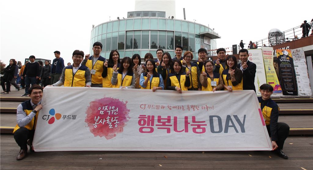 CJ푸드빌 임직원들로 구성된 봉사단이 지난 26일 지역아동센터 초등학생을 N서울타워로 초청해 문화충전을 통한 교감의 시간을 가진 뒤 기념촬영을 하고 있다. <br />