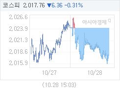 2016년 10월 28일 코스피 지수는 4.70p (0.23%) 하락한 2019.42로 마감했습니다.금일 (2시40분 기준) 코스피 주요 상승 종목은 DSR제강,고려산업,DSR이며, 코스피 주요 하락 종목은 JW생명과학,유한양행,JW홀딩스입니다.아경봇 기자 r2@asiae.co.kr<ⓒ세계를 보는 창 경제를 보는 눈, 아시아경제(www.asiae.co.kr) 무단전재 배포금지>