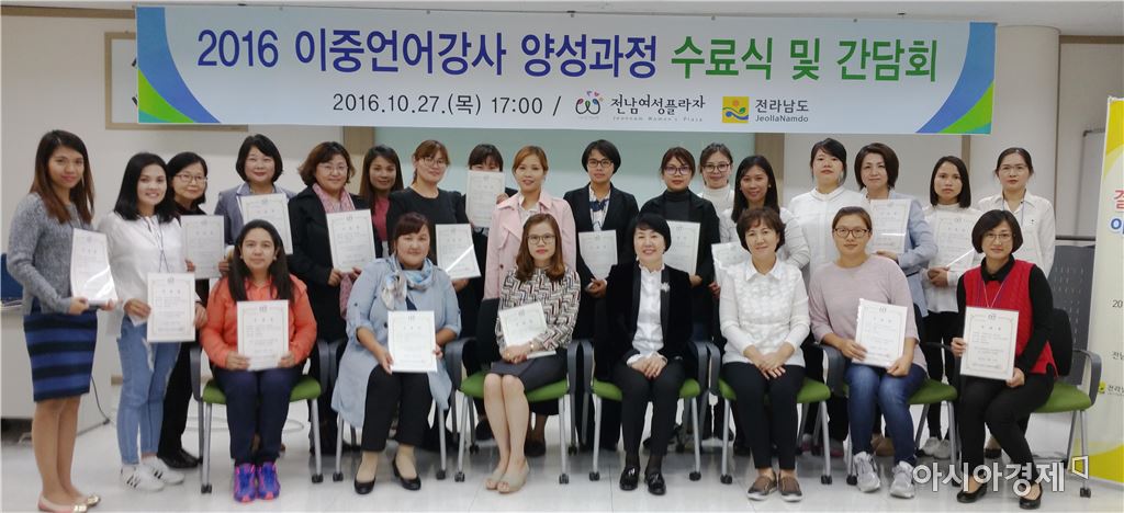 "모국어 활용한 안정적 정착 지원…올해 22명 등 총 89명" [아시아경제 노해섭 기자]전라남도는 결혼이주여성들이 한국사회에 안정적으로 정착하도록 지원하기 위해 이중언어강사 양성교육을 실시, 올해 우에미찌미와꼬 씨를 포함한 22명이 수료했다고 28일 밝혔다.이중언어강사 양성교육은 지난 2013년부터 실시해 올해까지 총 89명이 수료했으며 이 가운데 35명이 취업했다.이중언어강사는 결혼이주여성의 가장 큰 장점인 모국어 능력을 활용하기 위한 것이다. 아동과 의사소통, 아동의 문제행동 대처법, 외국어 교수법 및 교육현장 실습을 통한 현장 적응능력 등의 교육을 실시해 양성한다.양성된 이중언어강사는 방과후 강사, 공공도서관 및 어린이집 외국어 강사 등으로 취업해 개인의 모국어 능력을 십분 발휘하면서 자아 존중감을 높일 수 있고, 안정적 자립기반을 구축할 수 있다.허강숙 전라남도 여성가족정책관은 “앞으로 이중언어강사 양성뿐만 아니라 모국어 상담원 양성, 다문화사회적기업 육성 등 경제적 자립 기반 마련과 양질의 일자리 취업 연계를 통해 결혼이주여성의 능력 발휘와 조기 정착을 지원할 계획”이라고 말했다.노해섭 기자 nogary@<ⓒ세계를 보는 창 경제를 보는 눈, 아시아경제(www.asiae.co.kr) 무단전재 배포금지>
