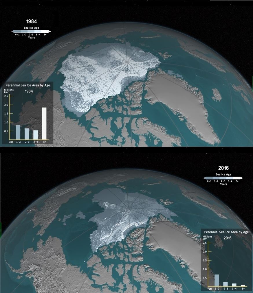 ▲북극의 다년생 얼음(하얗게 그림자 진 부분)이 갈수록 줄어들고 있는 것으로 나타났다.[사진제공=NASA]