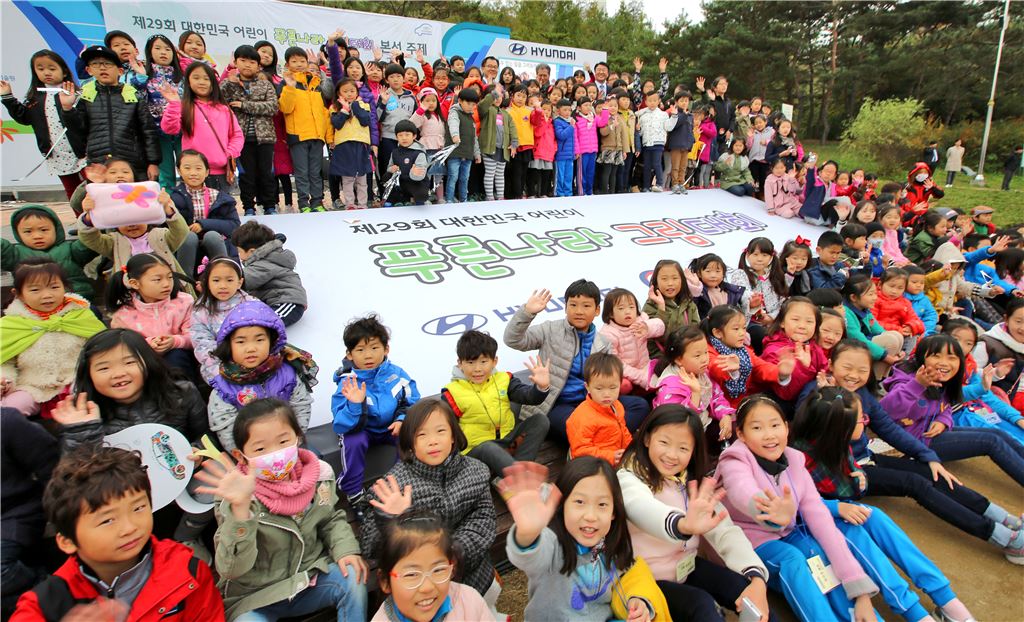 현대자동차는 환경보전협회와 공동으로 유치원생과 초등학생이 참여하는 '제29회 대한민국 어린이 푸른나라 그림대회'를 29일 개최했다. 사진은 제29회 대한민국 어린이 푸른나라 그림대회에 참가한 어린이들이 기념촬영을 하고 있는 모습.<br /> <br />