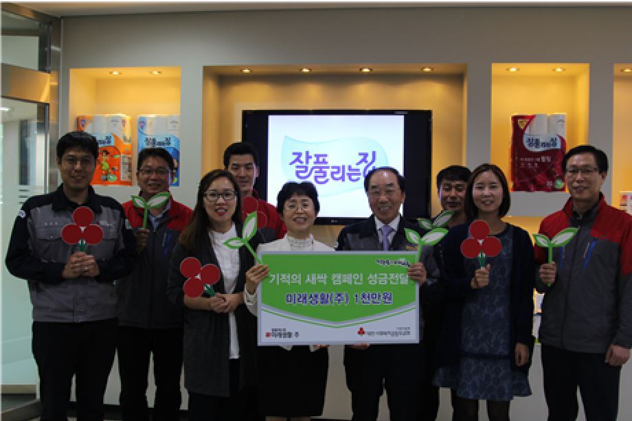 [아시아경제 정동훈 기자] 화장지 전문 제조업체 미래생활은 지난 28일 대전사회복지공공모금회를 통해 '기적의 새싹 캠페인' 성금 약 1000만원을 기탁했다고 밝혔다. 이번 성금전달식을 통해 미래생활은 변태섭 명예회장의 팔순기념 사진전 수익금인 약 1000만원을 기탁했다. 성금은 대전지역의 장애아동 지원과 어린이재활병원 건립을 위한 모금캠페인인 기적의 새싹 캠페인을 위해 전달되었다.기적의 새싹 캠페인은 사단법인 토닥토닥과 TJB 대전방송, 대전복지효재단, 사회복지 공동모금회가 공동 주최하는 장애아동과 어린이재활병원건립을 위한 모금프로젝트다. 지난 9월26일부터 모금이 진행 중이다. 미래생활㈜ 변태섭 명예회장은 "지역의 소외되고 어려운 이웃을 위해 앞으로도 관심을 아끼지 않겠다"고 전했다.정동훈 기자 hoon2@asiae.co.kr<ⓒ세계를 보는 창 경제를 보는 눈, 아시아경제(www.asiae.co.kr) 무단전재 배포금지>